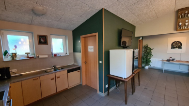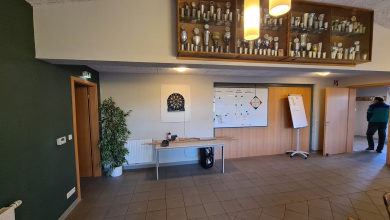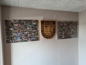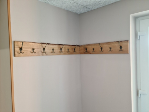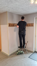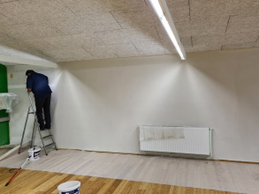 Im Oktober 2021 folgte der zweite Abschnitt der Renovierung. Nun war der Aufenthaltsraum an der Reihe. Dieser musste zunächst leergeräumt werden, ehe auch dort die Wände neu gestrichen wurden. Nachdem die Wände nun rund 10 Jahre in einem warmen Orangeton erstrahlten, ging man es nun etwas dezenter an. Ein feines Lichtgrau macht den Raum jetzt deutlich heller. Eine Wand wurde dabei als Highlight mit einem dunklen Tannengrün versehen. Auch hier wurde eine neue Garderobe installiert und die beliebte Dartscheibe bekam eine neue Pfeilfangwand spendiert.