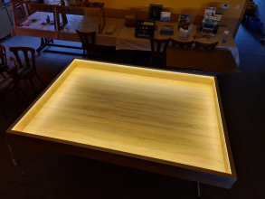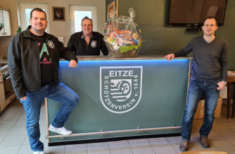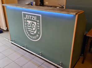 Kurzerhand machte sich erneut Patrick Panning ans Werk und nahm Maß und erstellte erste Entwürfe. Dabei holte er auch Karsten Timm wieder ins Boot, der mit seinem Wissen zunächst bei der Planung geholfen hatte und danach auch handwerklich wieder mit dabei war. Die beiden haben dann vor Ort den zwei Meter langen Tresen gebaut, der zwei Kühlschränke integriert hat und als Besonderheit mit einem LED-Band und dem Wappen des Schützenvereins verziert wurde. Heinrich Hamann konnte die passenden Barhocker dazu liefern. Pünktlich zur Weihnachtsfeier im Dezember 2021 konnte der Tresen seine Premiere feiern.