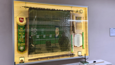 Im November 2020 startete der 2. Vorsitzende, Patrick Panning dann ein weiteres Projekt. Die über 130 Jahre alte Schützenfahne, die bis 1982 im Einsatz war, sollte aus dem Lager des Domherrenhauses zurückgeholt werden und einen Ehrenplatz im Schützenhaus erhalten. Die gemalte Fahne wurde dann von einer Fachfirma in Karlsruhe gegen den weiteren Verfall konserviert. Dabei wurde die Fahne aufgetrennt und mit einer neuen, dickeren Schicht Stoff verstärkt, ehe Sie wieder zusammengenäht wurde und mit einer durchsichtigen Folie im Steppdeckenprinzip vernäht wurde.