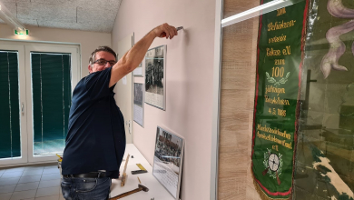 Um die Schützenfahne dann sicher in der Schießhalle zu präsentieren, hatte sich Patrick Panning die Hilfe von Karsten Timm aus Kükenmoor geholt. Der gelernte Tischler war federführend beim Bau eines etwa 2 x 1,50 Meter großen Schaukastens, in der die Fahne später aufgehängt wurde und mit einer Glasscheibe vor Berührung geschützt wurde.