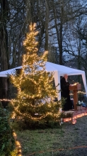 Schon seit einigen Tagen steht vor der Eitzer Friedhofskapelle ein schön beleuchteter Christbaum. Er soll ein Zeichen dafür sein, dass hier draußen auf dem Parkplatz an Heilig Abend etwas stattfinden wird. Denn die traditionelle Christvesper am 24. Dezember kann leider nicht in der Kapelle gefeiert werden. Anstelle dessen wird aber um 16.00 Uhr als Einstimmung auf den Weihnachtsabend eine Andacht im Stehen vor der Kapelle abgehalten. Dabei muss der Gemeindegesang wegen der Corona-Regeln leider entfallen. Während der Andacht müssen Masken getragen und der Abstand eingehalten werden. Dennoch setzen Ortsbürgermeisterin Anja König, Kirchenvorsteherin Claudia Wittboldt- Müller von St. Andreas und Pastor i. R. Wilhelm Bechtler mit anderen alles daran, dass es eine schöne und stärkende Atmosphäre sein wird. Auch zu diesem Gottesdienst ist eine Anmeldung erforderlich. Dafür bitte bei Familie Wittboldt- Müller unter Tel. 63443 anrufen oder eine E-Mail an