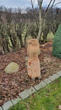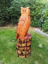 Seine größte Figur ist eine rund 2,00 Meter hohe Eule auf einem Sockel mit Steinmuster.