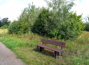 Die alte Bank ist nun an den Weg entlang der Gasstation ins Gewerbegebiet Finkenberg „gewandert“. Von ihr aus kann man den Blick auf die Obstbaumallee genießen.