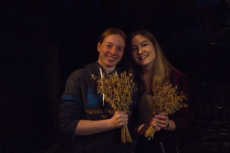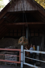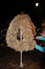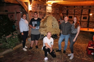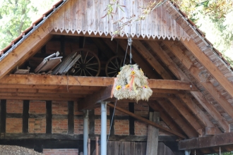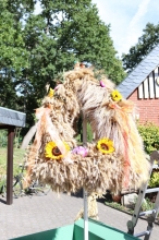 Die Erntekrone wurde nach dem kleinen Umzug in den Giebel von Familie Göbbert gehängt. Dort bleibt sie zwei Wochen hängen, ehe Sie in die St. Andreas Kirche gebracht wird.