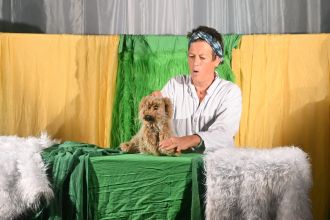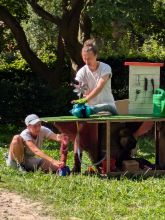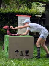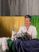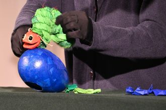 Nach der Vorstellung durften die großen und kleinen Zuschauer*innen Bühne und Puppen in Augenschein nehmen. Besonders beliebt waren ein Fühltest der Regenwurmstraße (prickelig und glitschig) und von Brontas Haar (weich und flauschig). Ganz Mutige konnten sogar Bronta „auf den Zahn fühlen“ (sie hatte ganze zwei).