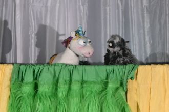 Die vielen kleinen und großen Zuschauer*innen wurden von der Einhornforscherin Frau Dr. Feenstaub begrüßt und dazu eingeladen, mit ihr gemeinsam ein Einhorn zu fangen. Das war aber ganz und gar nicht einfach. Ohne eine Möhre, ein Fernglas und ein Fell als Tarnung ging ja schon mal gar nichts. Ungewaschen oder die Zähne nicht geputzt? Oder zu laut? Keine Chance! Einhörner sind nämlich sehr geruchs- und geräuschempfindlich!