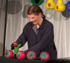 Die kleinen und großen Zuschauer und Zuschauerinnen erlebten eine begeisternde Aufführung. Ludmilla Euler führte ihr Publikum mit ausdrucksstarker Mimik und Stimme - piepsige Raupe und lispelnde Maus - durch alle emotionalen Höhen und Tiefen der kleinen liebevoll gestalteten Hauptfiguren und erntete zu Recht großen Applaus für ihr Spiel.